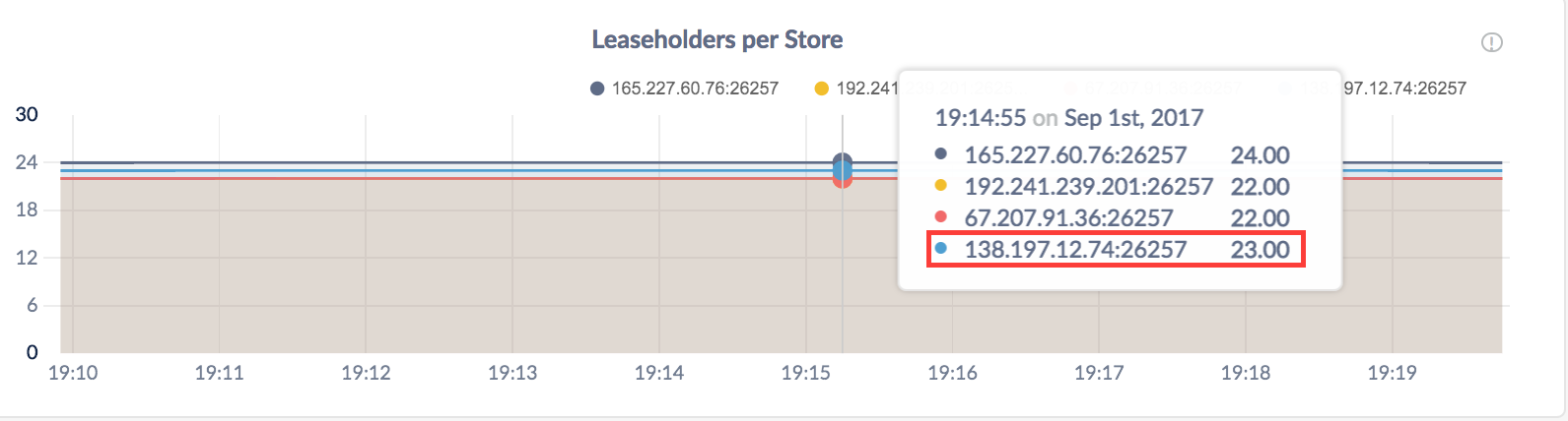 In the Admin UI Replication dashboard, again hover over the Replicas per Store and Leaseholders per Store graphs. For the decommissioning node, the counts should be 0: