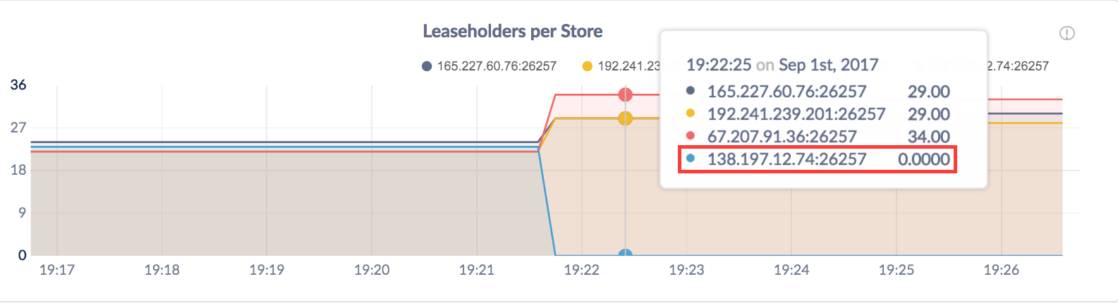 In the Admin UI Replication dashboard, again hover over the Replicas per Store and Leaseholders per Store graphs. For the nodes that you decommissioned, the counts should be 0: