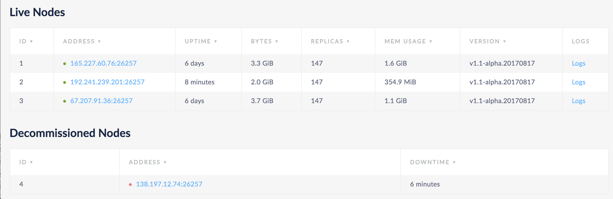 |  1 | 165.227.60.76:26257   | 91a299d | 2017-09-07 18:16:03 | 2017-09-07 16:30:13 | true    |               134 | false              | false       |